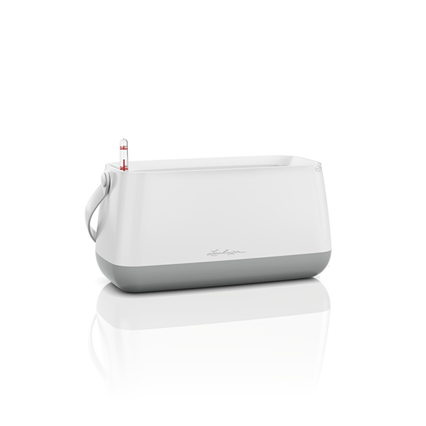 У комплект Lechuza Yula входять: нерозбірне кашпо (біле з сірим низом) із якісного міцного німецького пластику, індикатор рівня води та 2 гноти для автополиву рослин. Для декору та зручності транспортування кошик має ручку, яка може змінювати своє положення щодо горщика. Резервуар з водою знаходиться на дні кошика, а для поповнення запасів біля індикатора існують отвори, куди і потрібно заливати воду.