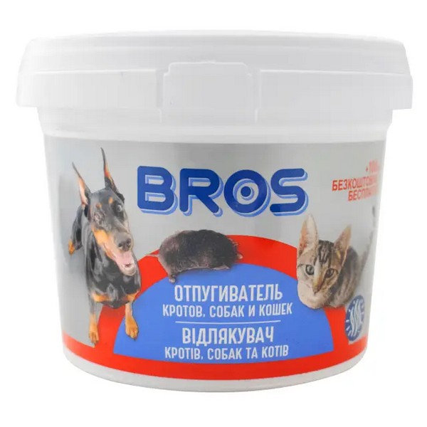 Гранульований препарат Bros використовується на різних присадибних ділянках з метою відлякування кротів, собак, котів та інших теплокровних тварин, які шкодять ґрунту, вашому врожаю, газону. Також препарат дозволяє відвадити собак та кішок від дитячих майданчиків, алей та інших ділянок. Діючою речовиною даного препарату є 2-ундеканон, який має різкий запах. Коти, собаки і кроти мають гострий нюх, тому даний препарат їх відлякуватиме. Даний засіб є гуманним методом боротьби із собаками, котами та кротами, що не впливає на стан здоров'я тварин. Препарат має відлякувальний запах для тварин, але не нав'язливий для людей. За сприятливих умов, які мають на увазі відсутність опадів, даний засіб зберігає ефективність до трьох тижнів.