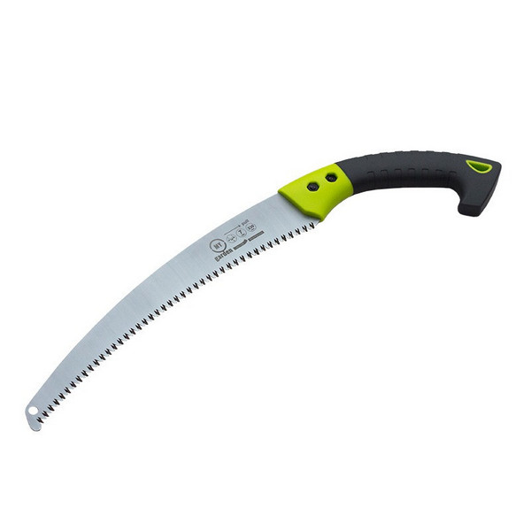 Садова пила з вигнутим лезом довжиною 330 мм, виготовлена з японської високоякісної сталі SK5. Призначена для обрізання сухих та живих гілок до 30мм. Завдяки вигнутому профілю леза значно зменшується зусилля, яке потрібно докласти під час роботи. Поверхня зрізу гладка, краї рівні, що сприяє надійному зарощенню новою корою. Двокомпонентна ручка надійно зафіксована двома гвинтами. Тригранне загострення зуба зворотної спрямованості полегшує роботу з гілками. Загартування зубів збільшує ресурс інструменту. Ручка має отвір для зберігання пилки в гаражі або коморі.