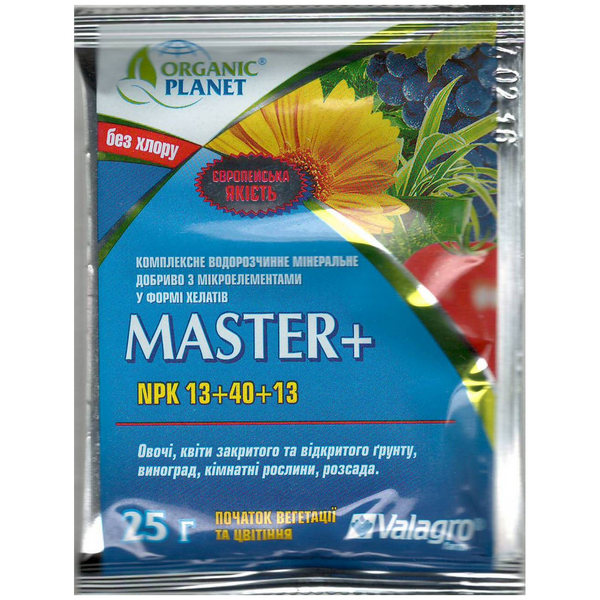 Master (Мастер) 13-40-13, 25 г – комплексне добриво, що застосовується на ранніх фазах вегетації та після висадки розсади чи саджанців для активного розвитку кореневої системи. Сприяє кращому запиленню та зав’язуванню плодів (овочів, фруктів, декоративних культур, ягід). В складі комплексу містяться всі необхідні макро- та мікроелементи – велика кількість фосфору (необхідного в період зав'язки), завдяки чому забезпечується висока хімічна чистота культур.